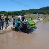 今年も美十から田植えの応援に来ていただきました 実際に田植え機に乗って植えていただきました 圃場整備後の田植えは深いところもあり歩行用田植え機での田植え 集合写真も忘れずに